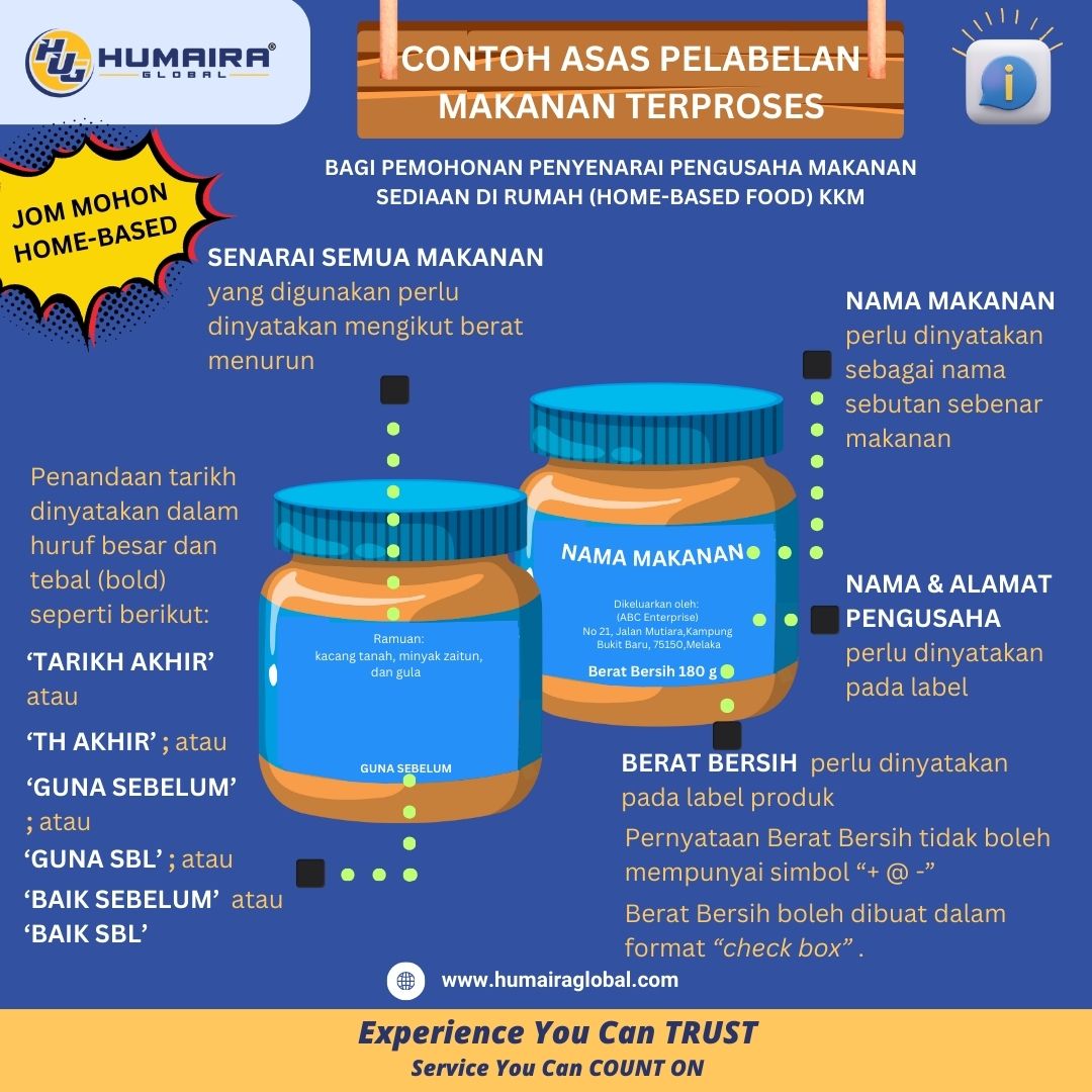 Q: Saya tak berapa tahu apa elemen label yang diperlukan di artwork produk saya? A: Terdapat 5 label di perlukan dalam satu produk makanan 1. NAMA MAKANAN perlu dinyatakan…